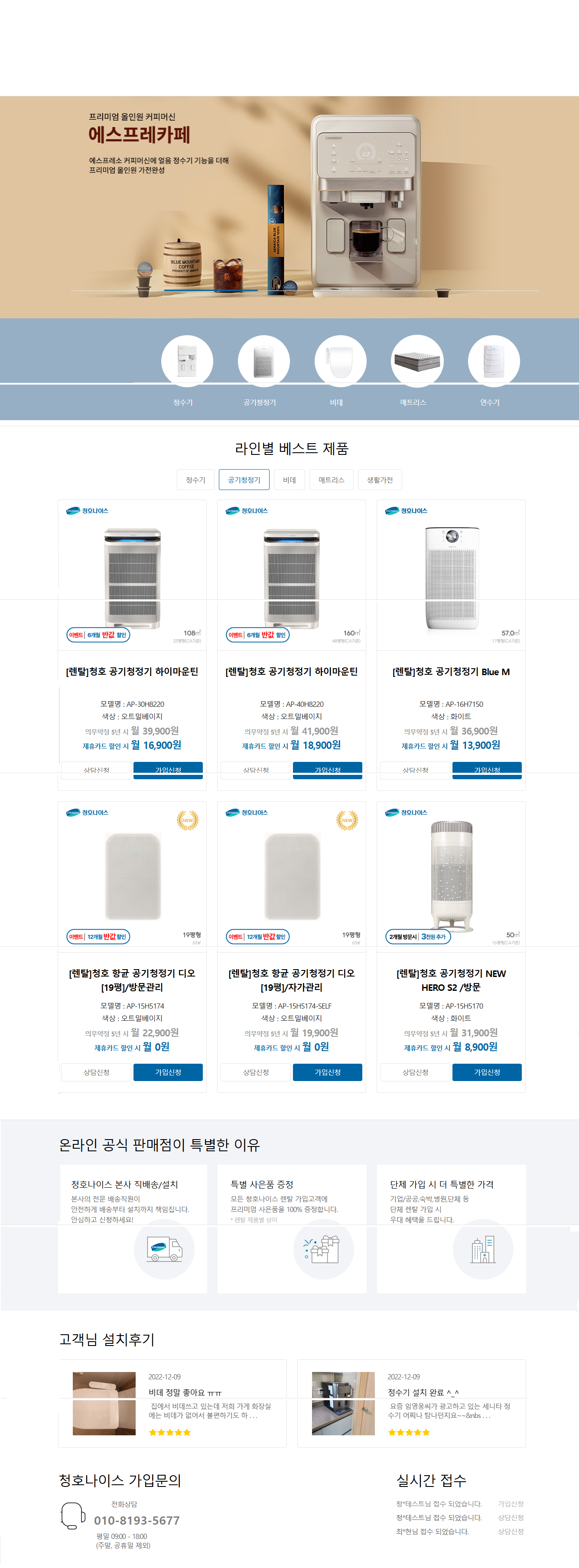 청호나이스 얼음정수기렌탈, 청호나이스정수기렌탈, 공기청정기렌탈, 비데렌탈, 커피정수기렌탈. 전지역 설치 가능+타사보상할인. 얼음정수기, 냉정수기, 냉온정수기, 공기청정기, 청호나이스홈페이지