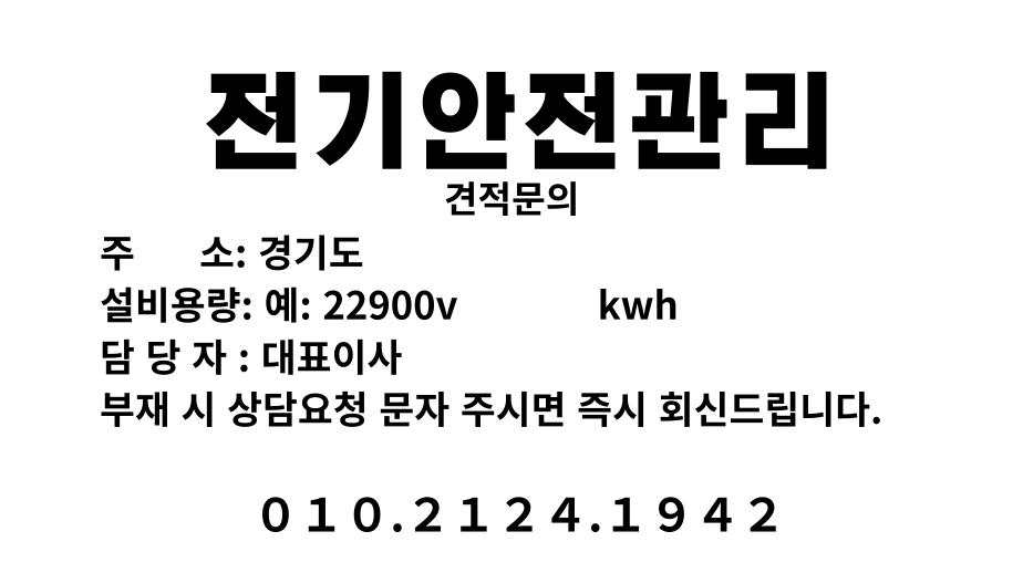 | 서울 경기 인천. 전기관련업무 ( 전기안전관리및대행, 전기안전진단, 전기공사, 전기설계, 전기감리,전기 안전점검 확인서 등 ). (0) | 2025.12.08 |